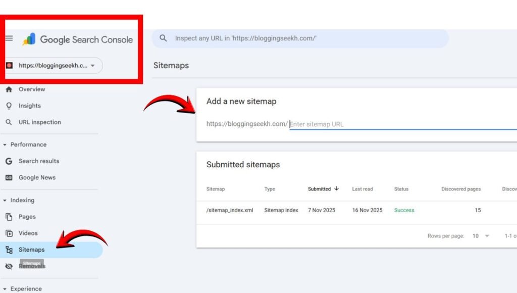 आपके sitemap. का URL आपके blog का नाम और Sitemap_Index.xml होता है. जैसे मेरे इस blog के sitemap का url होगा https://bloggingseekh.com/sitemap_index.xml यह Url आपको Google search console मे submit करना है.
